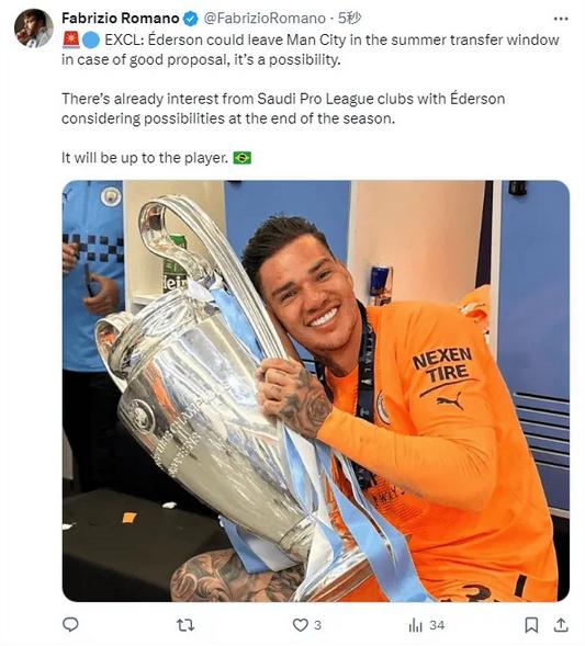 Romano: Saudi clubs interested in Ederson and Manchester City willing to release him【JIAYU]